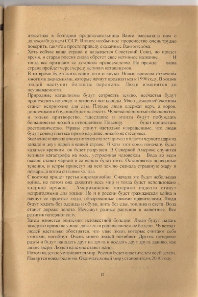 Вот наткнулся на интересную статейку 1964года публикации.Может конечно и совпадения, но уж больно познавательно. Цитата:"Хоть сейчас ваша страна и называется Советский Союз, но придет время, и старая Россия снова обретет свое истинное название. И тогда все признают ее духовное превосходство. Но прежде ваша страна пройдет через череду великих катаклизмов. В то время будут жить ваши дети и внуки. Новые времена отмечены многими знамениями, которые начнут проявляться к 1990 году. В жизни людей наступят большие перемены. Люди изменятся до неузнаваемости.Природные катаклизмы будут сотрясать землю, несчастья будут происходить повсюду и затронут все народы. Мясо домашней скотины станет непригодно для еды. Плохие люди одержат верх, а воров, доносчиков и блудниц будет несчесть.Чувства полностью обесценятся и только притворство, тщеславие и эгоизм будут побуждать большинство людей к отношениям. Повсюду будет процветать ростовщичество. Нравы станут настолько извращенные, что люди будут совокупляться прямо на улице, никого не стесняясь.Знамением начала апокалипсиса станет приход к власти черного царя на западе и двух царей в вашей стране. И хотя этот союз поначалу будет казаться крепким, он будет разрушен. В Северной Америке случится великая катастрофа на воде, устроенная человеком. Вода во всем океане станет черной и ее нельзя будет пить. Остановятся подводные течения, и ветры принесут на всю землю сначала страшную жару и пожары, а потом сильные холода.С востока придет третья мировая война. Сначала это будет небольшая война, но потом она захватит весь мир и тогда будет использовано ядерное оружие. Американские материки надолго станут непригодными для жизни. Но и в россии будет гражданская война и начнут ее простые люди, обворованные своими правителями. Люди будут ходить без одежды и обуви, жить без еды, топлива и света. Вода станет дороже золота. Исчезнут разны